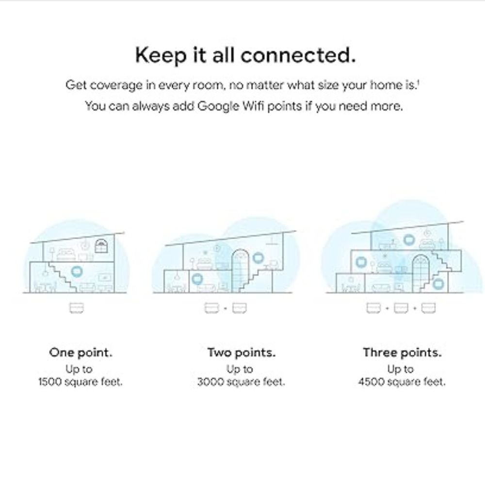 - Google Wifi gives you whole home coverage; 1 Pack covers up to 1500 square feet and 3 Pack covers up to 4500 square feet; points work together to create a mesh network for more coverage