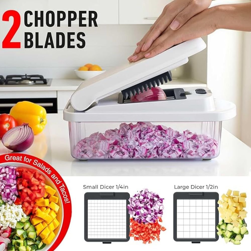 - 8 Awesome Blades For the Price of 4 – Three different sized chopper blades and 5 interchangeable blades for slicing, julienne, grating & shredding offer the functionality of multiple kitchen tools in just one, highly versatile, kitchen gadget. The high-quality stainless-steel blades will create perfectly chopped onions, tomatoes, and peppers for salsa, or shred an entire cabbage for coleslaw in no time.